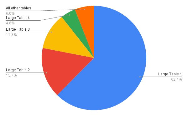 - The distribution of data across tables was very uneven with 5% of tables accounting for 95% of storage space